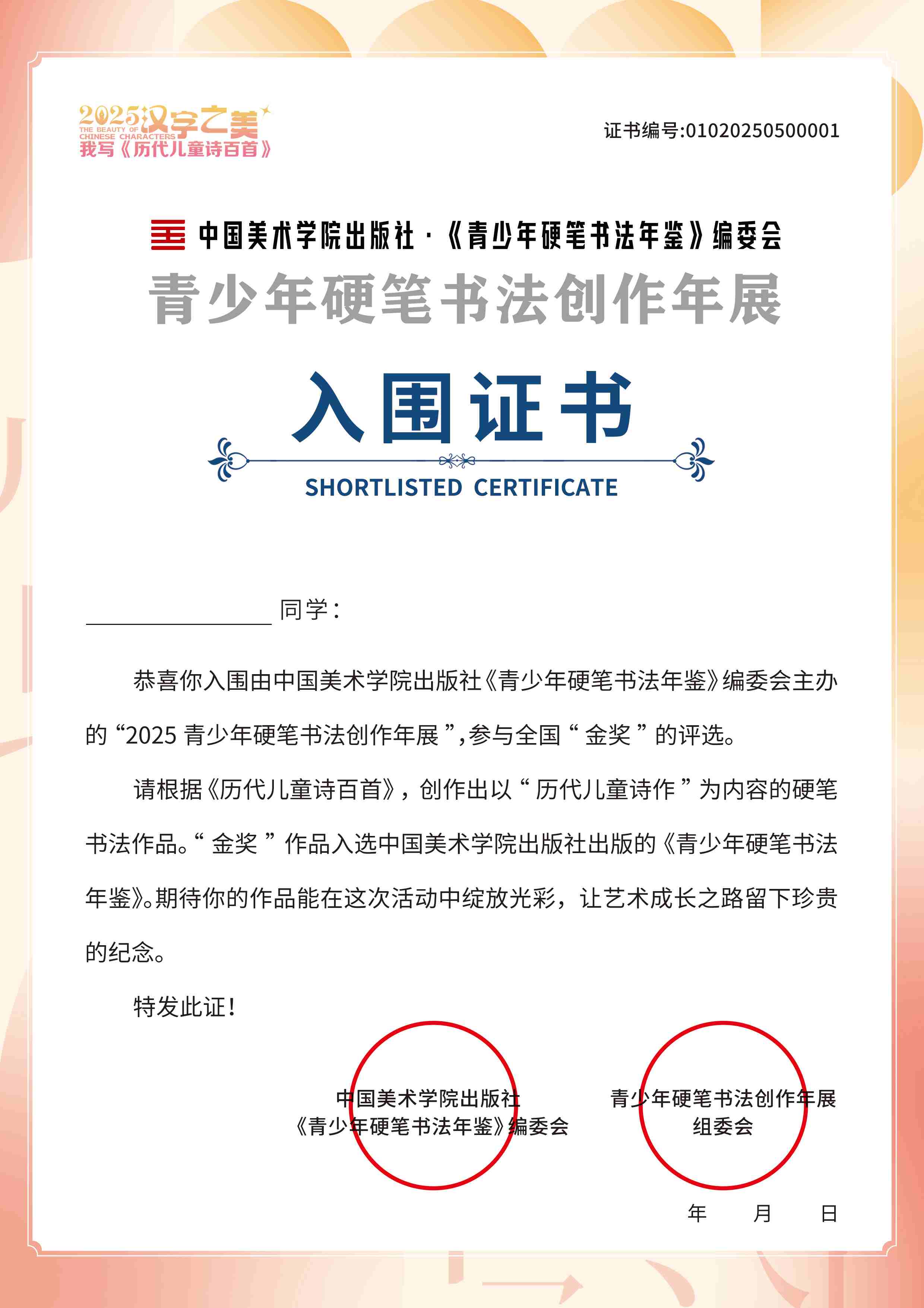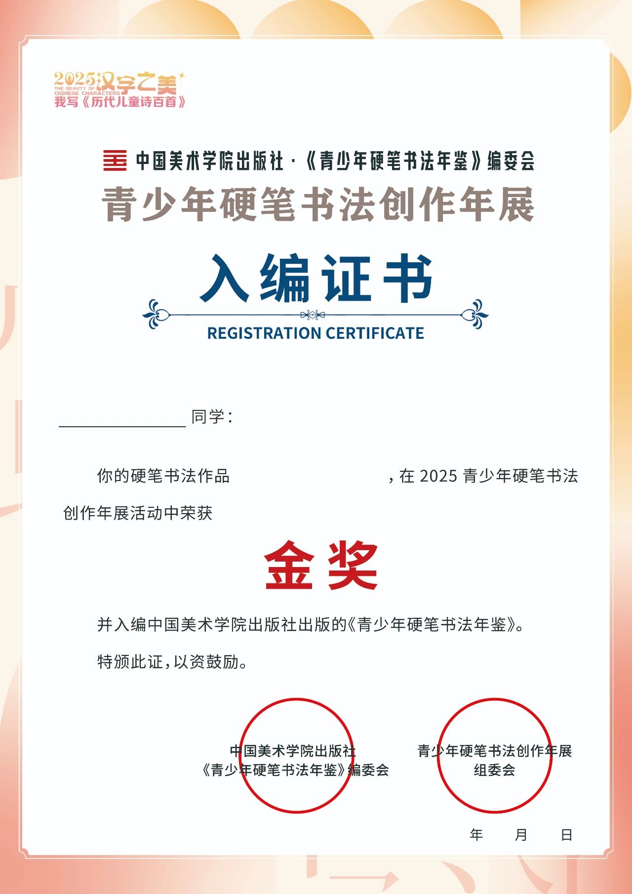 2. 经全国评委会评选的“金奖”作品,入编《青少年硬笔书法年鉴》;